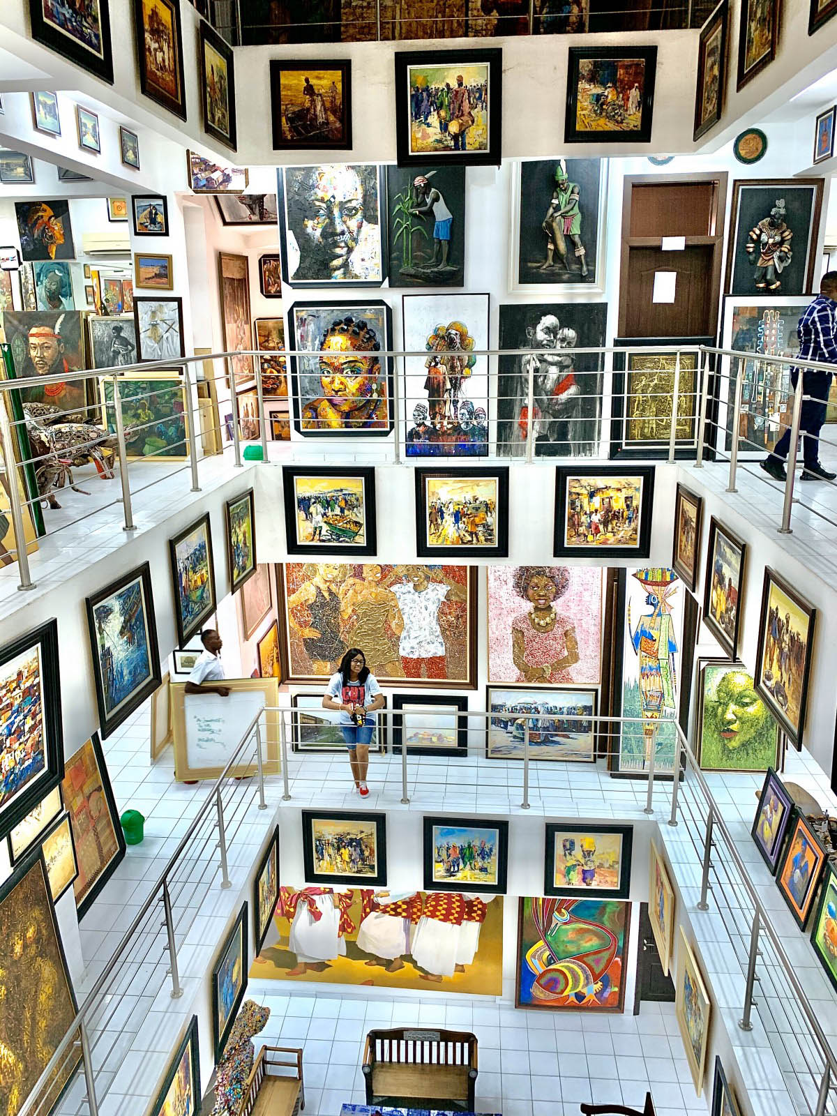 The Nike Art Gallery was founded in 2007 by world renowned artist, Chief (Mrs.) Nike Okundaye, with the principal objective of using it to develop and enhance our cultural heritage. The gallery undoubtedly has grown to be the biggest reservoir of indigenous Nigerian artwork collection in Nigeria and currently the largest privately-owned art gallery in Africa. Since it was established, in 2007, the gallery now has four branches in Nigeria: in Lagos, Abuja, Osogbo, and Ogidi-Ijumu in Kogi State. The gallery in Lagos is the largest with four floors of artworks of different descriptions such as paintings in different media, batik and Adire fabrics, embroidery, appliqué, beadworks, pen and ink drawing on paper and on canvas, aluminum & copper works and sculptures also in different media, all set out in the most conducive climatic condition. The Nike Art Gallery in Lagos is a hub for art lovers, art collectors and visiting tourists in Nigeria.